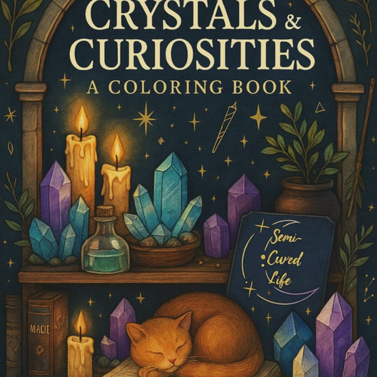Crystals & Curiosities is a 32-page spiral-bound coloring book packed with crystal cabinets, potion shelves, sleepy cats, and spellbound décor.